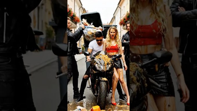 The video opens on a picturesque, sunny street as a young food delivery driver on a small scooter rides along. He’s carrying a delivery box with what appears to be fast food. Suddenly, he’s closely overtaken by a man and a woman on a powerful, dark motorcycle. The bikers, exhibiting extreme arrogance, cut him off sharply. This forces the delivery driver to swerve, leading to a nasty crash. He is thrown to the ground, and the contents of his delivery—burgers, fries, and drinks—are scattered and ruined across the asphalt.