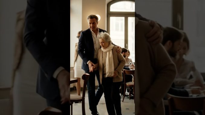 Fortunately, the atmosphere of cold indifference is shattered by a man seated nearby. Observing the scene, he immediately rises and rushes to the elderly woman’s aid. His first act is one of pure empathy: he crouches down, takes her hand, and helps her gently to her feet. He then guides her to a table, ensuring she is safe and comfortable. The dignity and care he shows are a silent rebuke to the young woman’s callousness. He asks, “Madam, are you all right?” She replies, “I’m fine, just a little dizzy.” His actions speak louder than any words, illustrating the power of immediate, compassionate intervention.