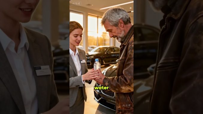 However, one small act of kindness cuts through the disdain. A young woman, a sales associate named Emma, approaches him. Nervous but firm, she offers him a bottle of water and, defying her boss’s angry glares, offers to talk about the car anyway, assuring him he doesn’t have to buy it. This small gesture—a free bottle of water and a willingness to offer a service despite Frank’s appearance—is the only moment of genuine humanity he receives.
